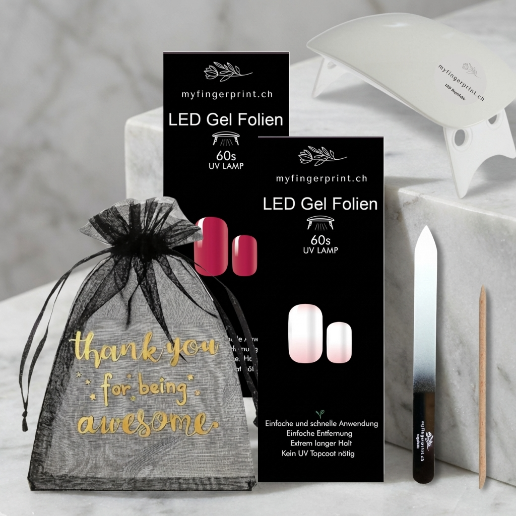Im Geschenk Set sind 2 LED Foliendesigns deiner Wahl, 1 LED Lampe mit USB Anschluss, 1 hochwertige Glasfeile und ein pflegendes Orangenholzstäbchen schön verpackt im Organza Beutel „Thank you for being awesome“